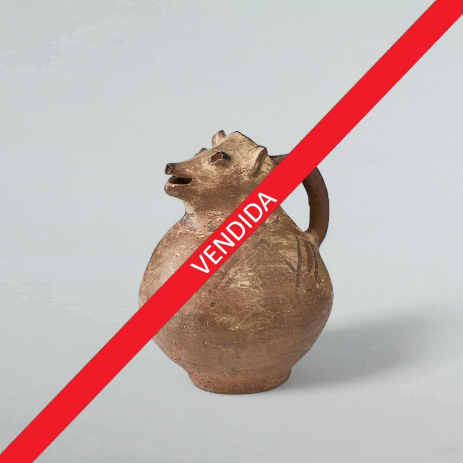 De barro cocido. Globiforme, el cuello termina en una cabeza que representa la de una comadreja. Un asa en la espalda.