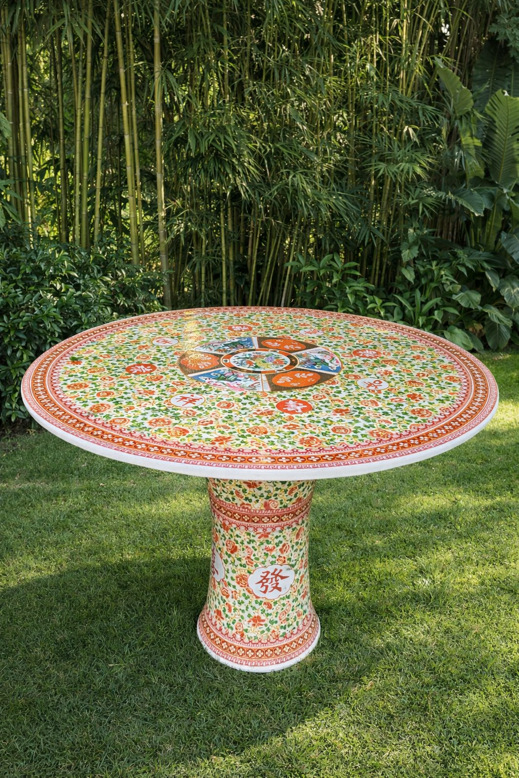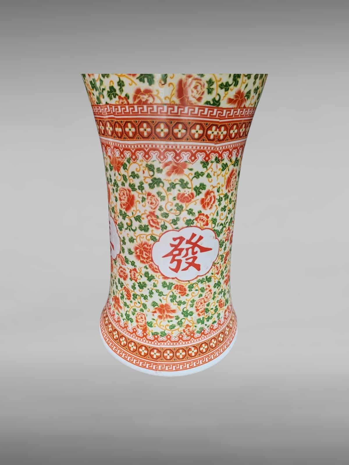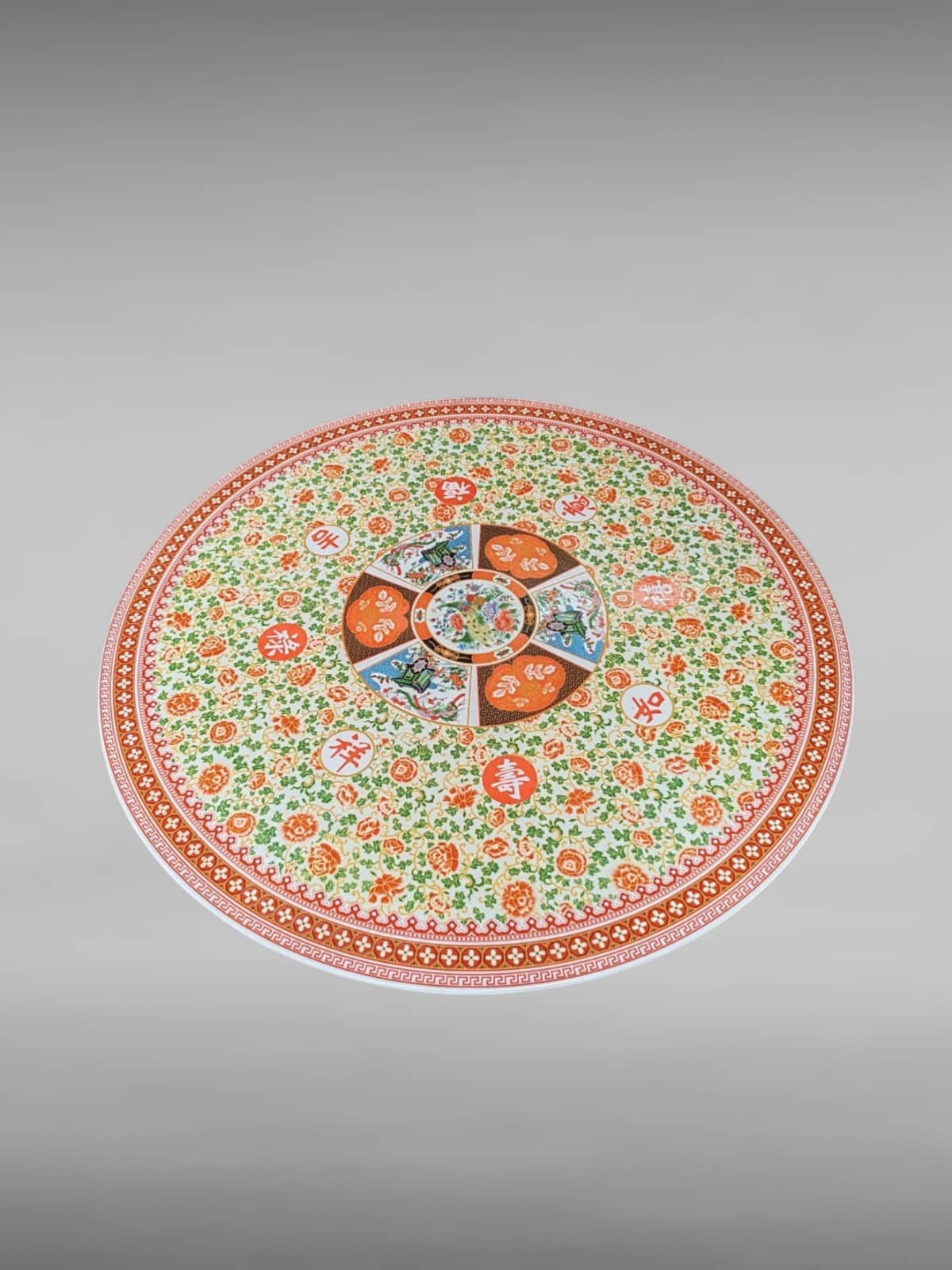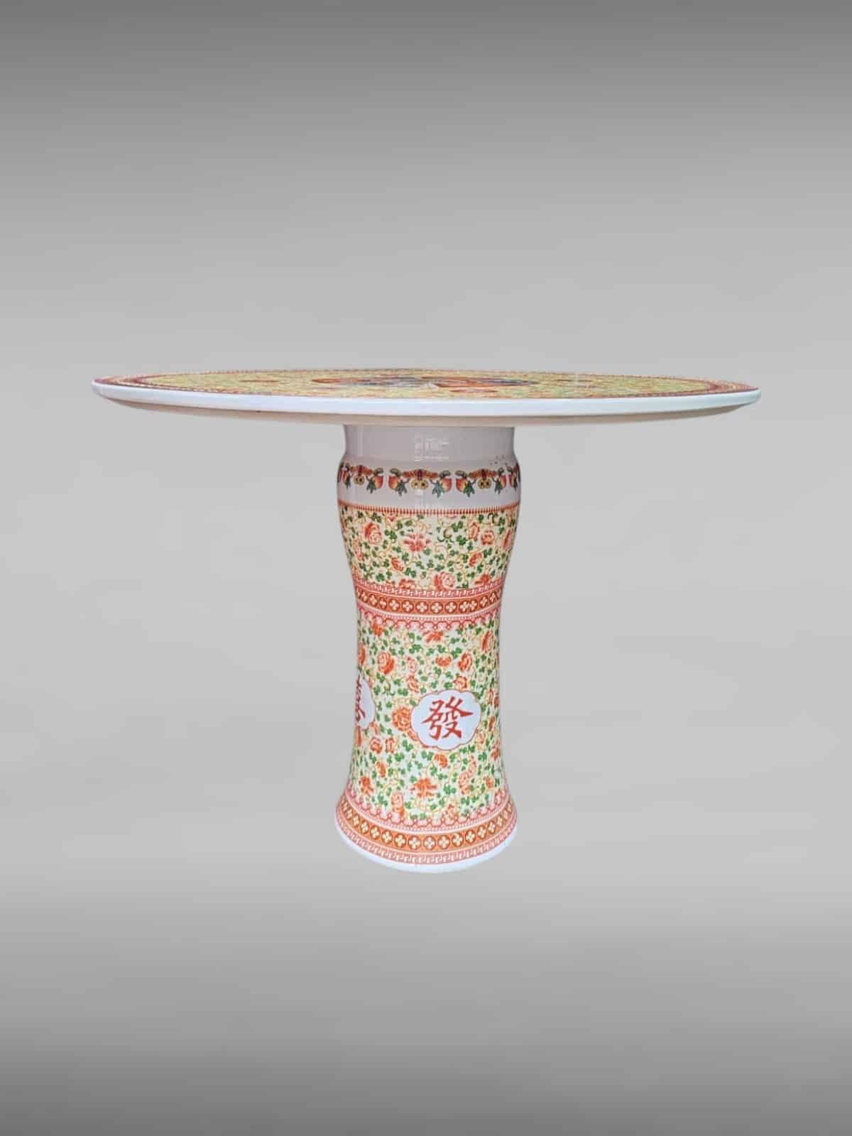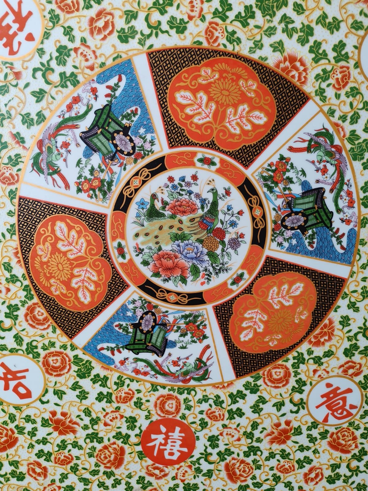 El pie repite el diseño floral de la tapa con reservas de letras chinas.