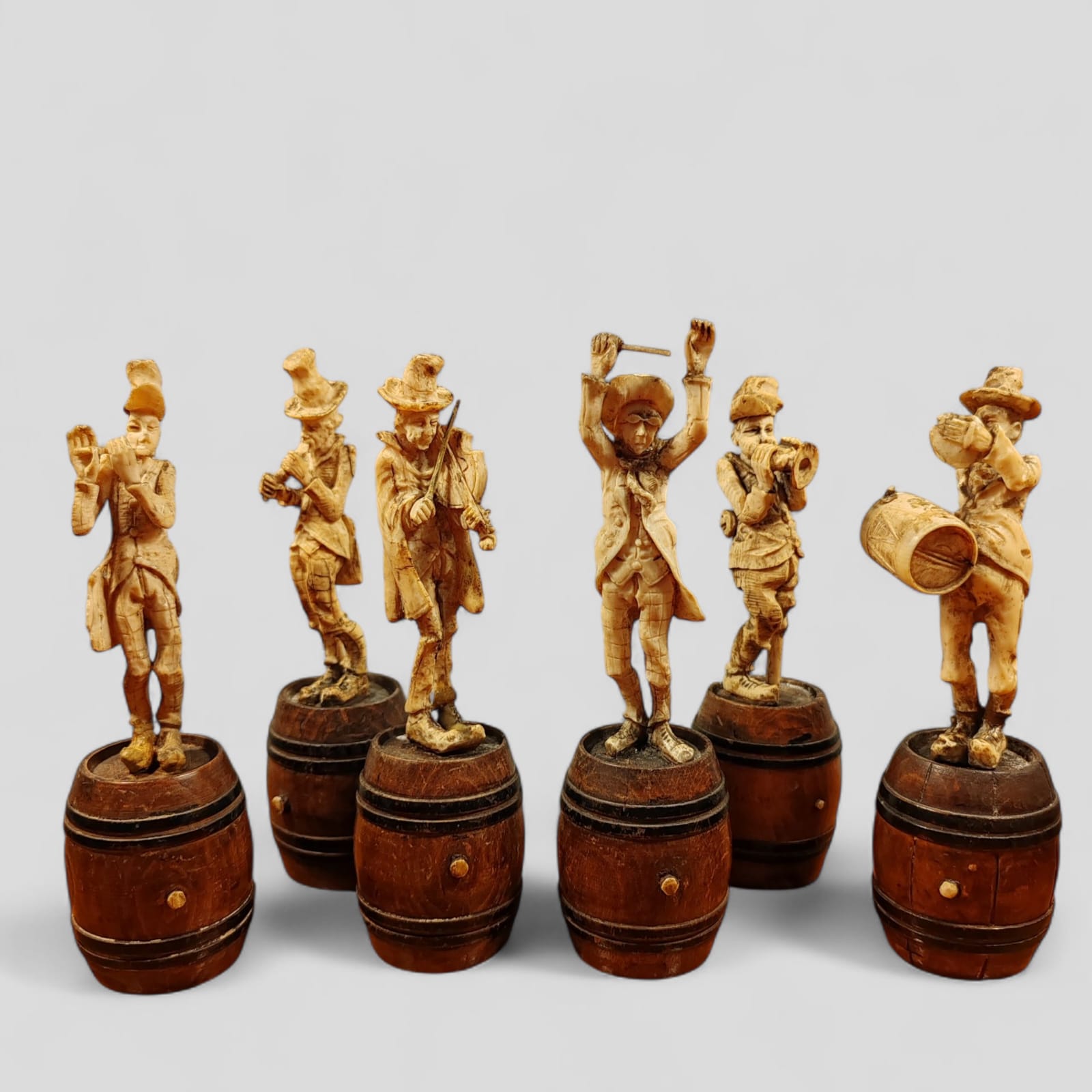 Seis tallas en marfil representando a su Director, y cinco músicos con diferentes instrumentos, todos sobre un barril de madera lustrada.