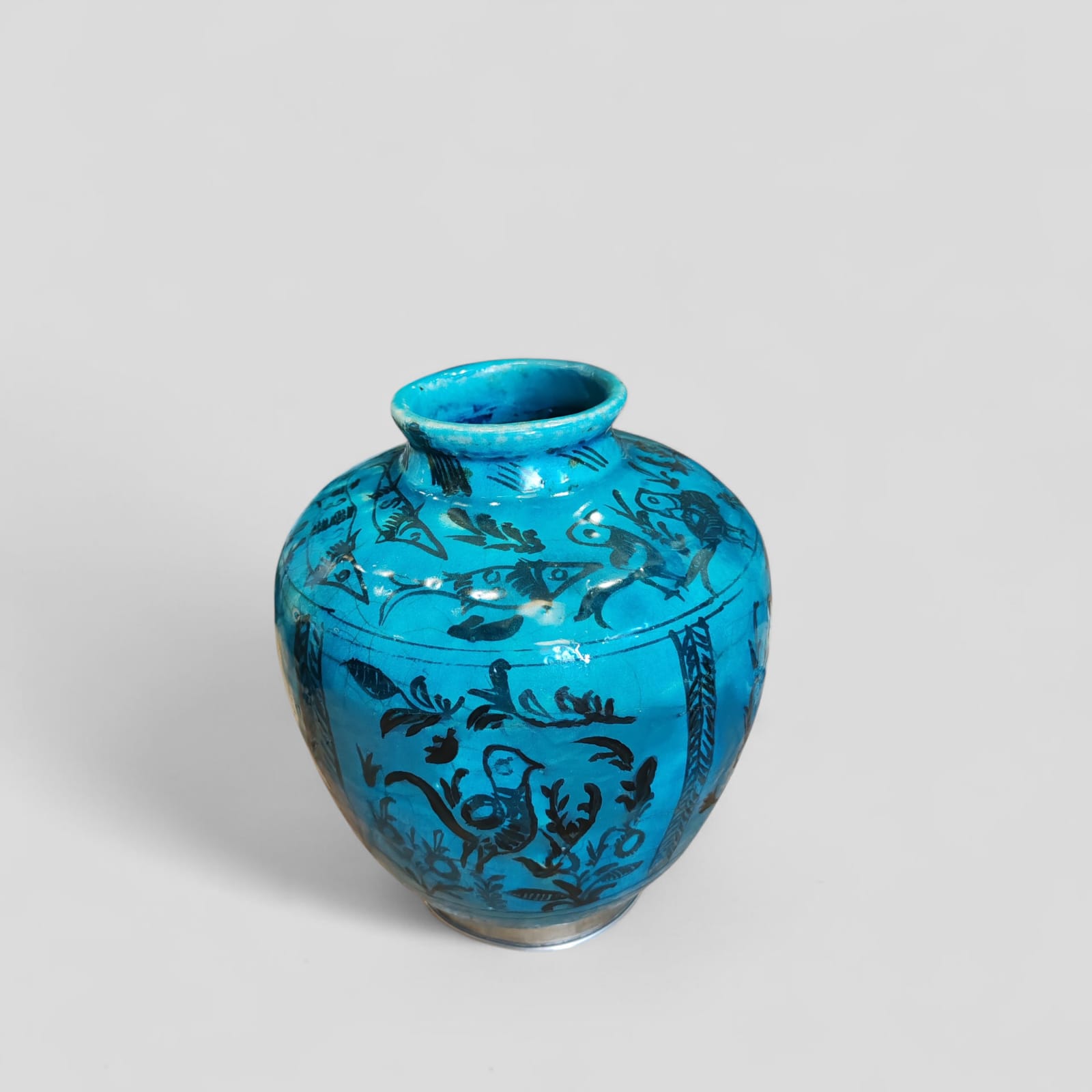 En cerámica esmaltada con decoración clásica en este tipo de alfarería.
